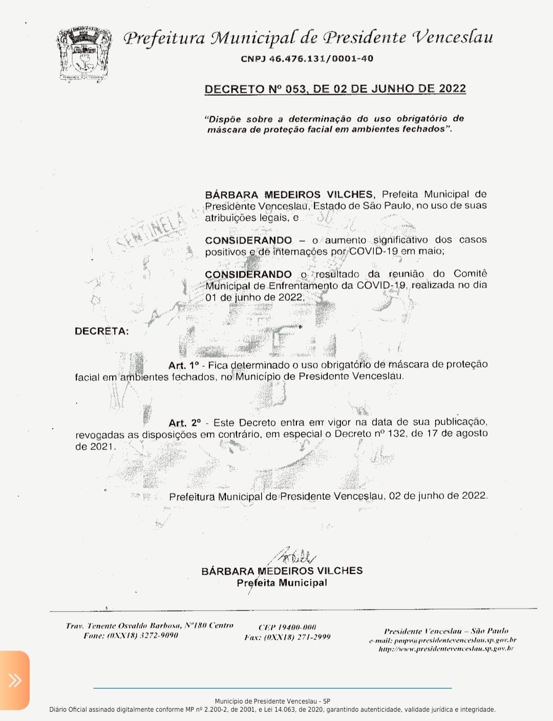 Baixe aqui o Decreto n° 053, de 02 de junho de 2022.