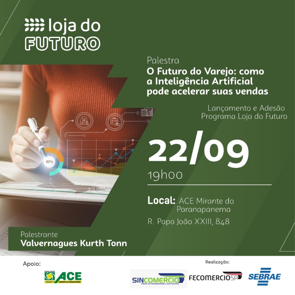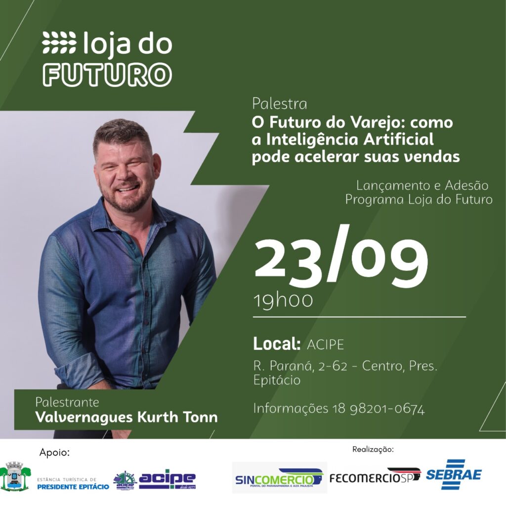 Empresários do comércio varejista da região têm um encontro marcado com a inovação, durante palestra gratuita O Futuro do Varejo: como a Inteligência Artificial (IA) pode acelerar suas vendas. Em Mirante do Paranapanema, o evento ocorre no dia 22 de setembro, na Associação Comercial e Empresarial (ACE) da cidade. Já em Presidente Epitácio, a palestra será no dia 23 de setembro, na Associação Comercial e Industrial (ACIPE) local, ambos com início às 19h. Faça a sua inscrição em Mirante do Paranapanema e em Presidente Epitácio.